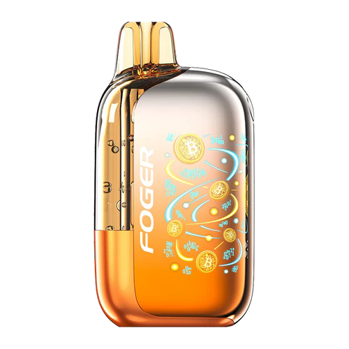Foger Vape 35K is a disposable vape with a Bitcoin-inspired design and transparent tank, featuring a rechargeable 850 mAh battery. It delivers up to 35000 puffs in Norm Mode (25,000 in Boost Mode). The device uses 0.8 ohm dual mesh coils and 50 mg/mL (5%) nicotine strength. It includes a curved OLED screen for real-time data, two wattage modes, adjustable airflow, and USB-C fast charging.
